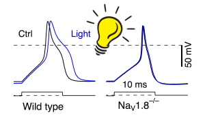 Stimulated action potentials of DRG neurons before (black) and after 150 s illumination with blue light (blue) from wild-type (left) and NaV1.8-deficient mice (right).