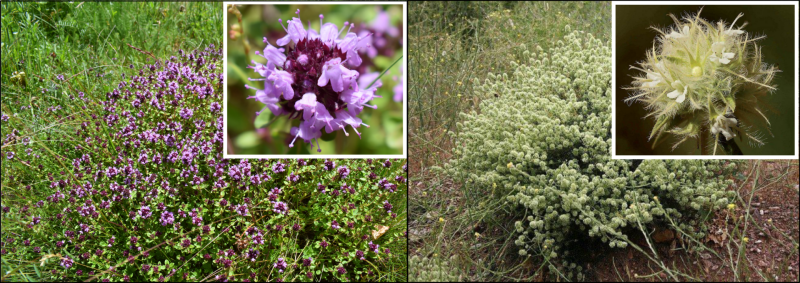 Contrasting Thymus morphotypes: (left) creeping, purple flowering T. pulegioides (sect. Serpyllum) with slightly dissected upper calyx teeth, and (right) erect, whitish flowering T. mastichina (sect. Mastichina) with hairy, deeply dissected upper calyx teeth (© Alchetron.com).