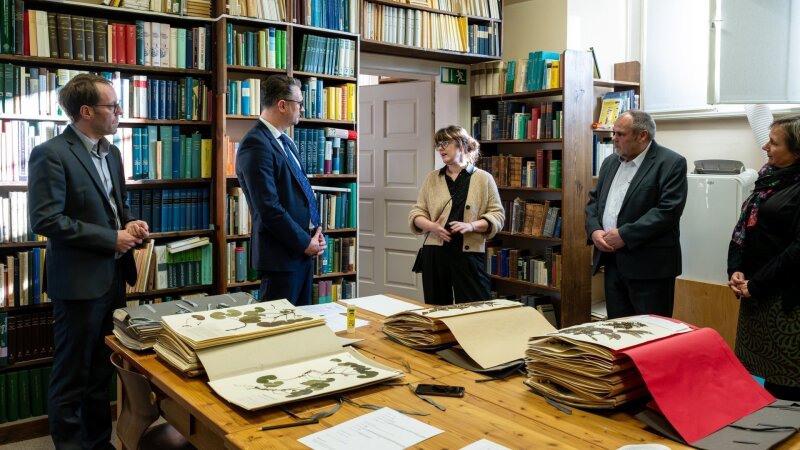 Heute (15. Januar 2026) haben der Thüringer Minister für Bildung, Wissenschaft und Kultur Christian Tischner, der Thüringer Wissenschafts-Staatssekretär Prof. Dr. Steffen Teichert, der Generaldirektor der Senckenberg Gesellschaft für Naturforschung Prof. Dr. Klement Tockner und der Präsident der Friedrich-Schiller-Universität Jena Prof. Dr. Andreas Marx Einblicke in das Digitalisierungsprojekt BOTANICA erhalten. In der Thüringer Universitäts- und Landesbibliothek (ThULB) stellten Bibliotheksdirektor Dr. Andreas Klinger und die Leiterin des Senckenberg Instituts für Pflanzenvielfalt Jena (SIP) Prof. Dr. Christine Römermann den Projektkontext vor. Beim anschließenden Besuch des Herbariums Haussknecht haben die Teilnehmenden über Inhalte, Ziele und Perspektiven der sammlungsbezogenen Biodiversitätsforschung am SIP Jena diskutiert.